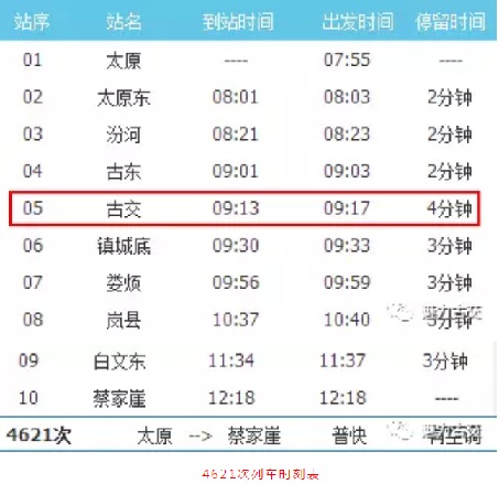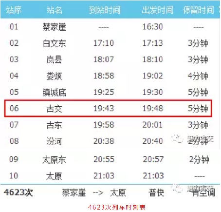 另一对为普速旅客列车,4621\4  4623\2次,定员1261人,包括9节硬座、2节硬卧。其中,4621\4次太原站6:30始发,11:00终到蔡家崖站,4623\2次蔡家崖站17:30始发,21:54终到太原站。2对列车途停白文东、岚县、娄烦、镇城底、古交、古东、汾河、太原东8站。