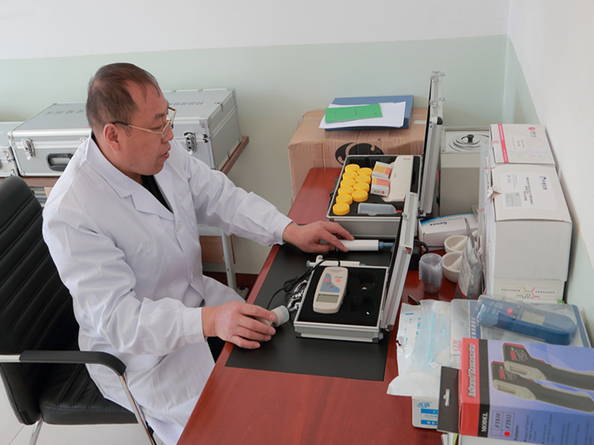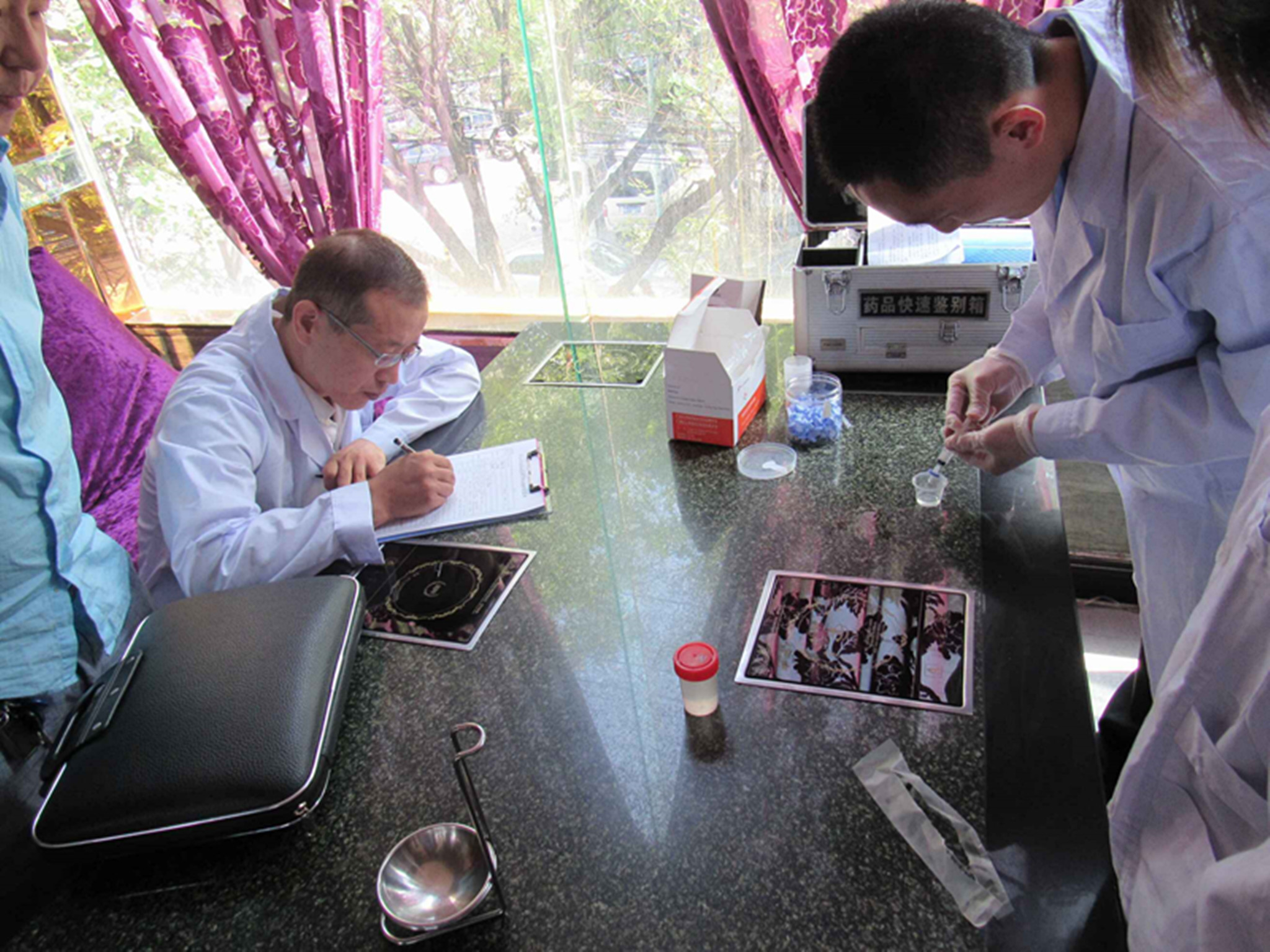图六:古交市河口食药监管站执法人员认真学习食品快检技术,全面提升监督执法水平。
