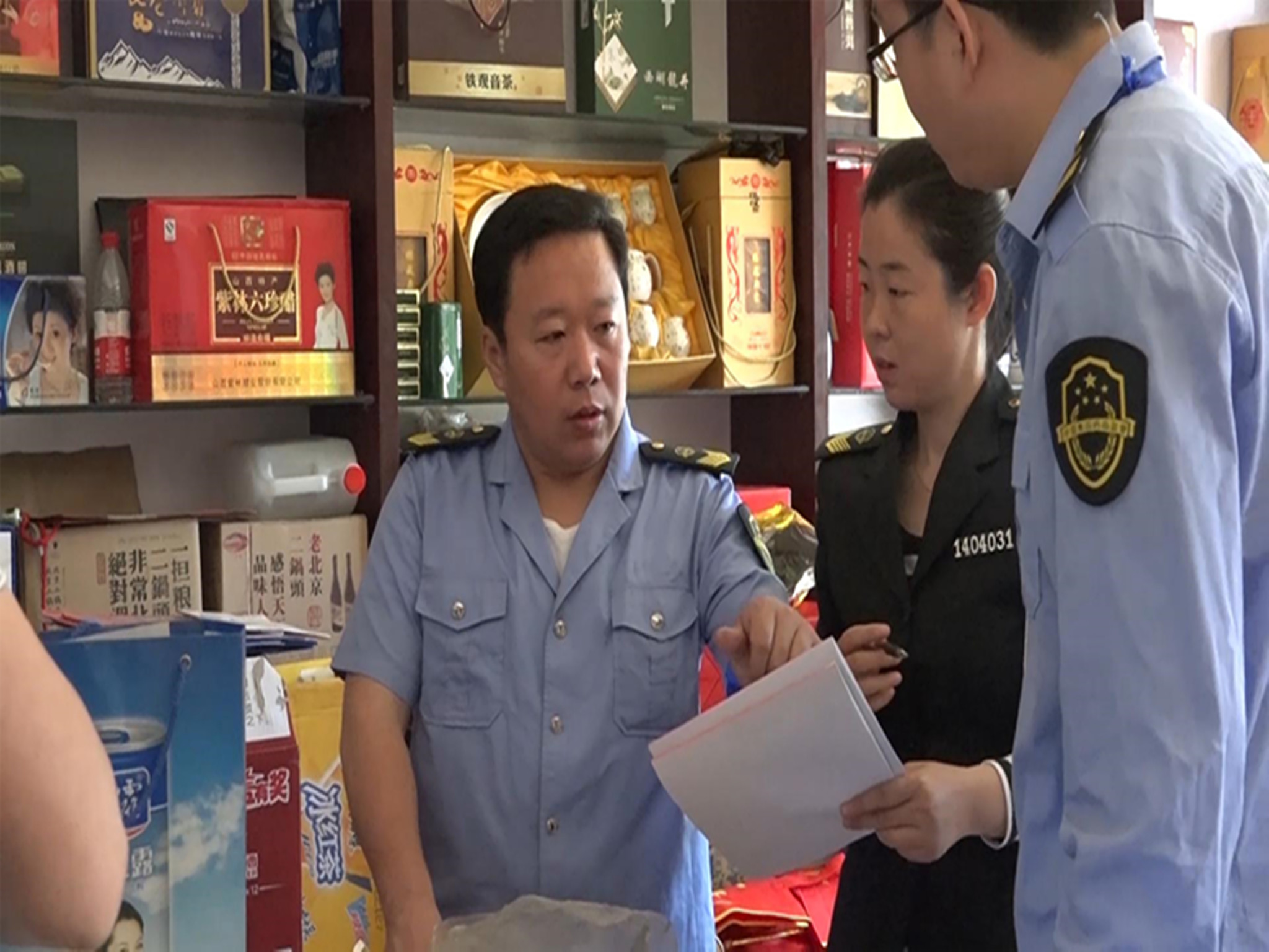图九:古交市食药监局执法人员认真检查商店台账及索证索票情况。